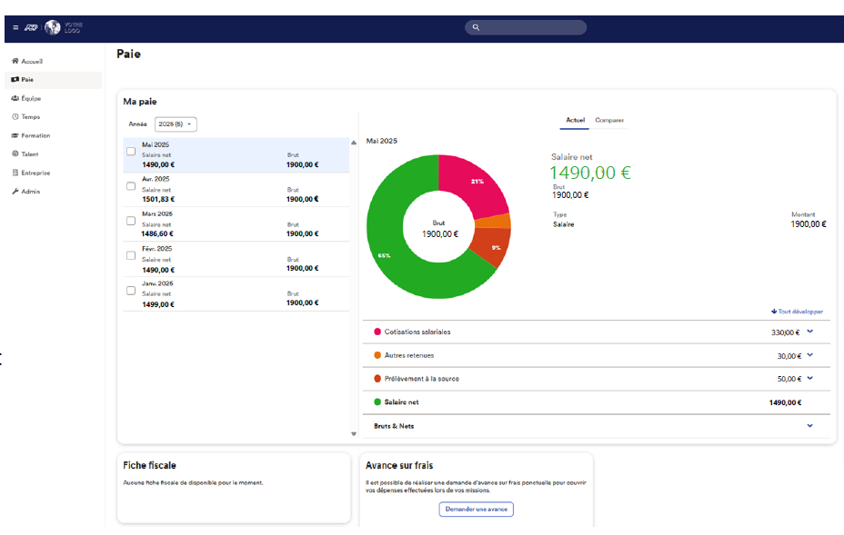 La section qui vous permet : Les modalités de première connexion diffèrent selon votre situation : Accéder à toutes vos informations personnelles et professionnelles de manière centralisée : Toutes ces modifications apportées sur ADP seront directement transmises à votre service RH, qui traitera vos demandes dans les meilleurs délais. Vous serez notifié par mail de l’évolution de votre demande. Votre demande d’attestations ou de documents a bien été envoyée au service RH, qui traitera cette demande dans les meilleurs délais. Vous serez notifié par mail de l’évolution de votre demande. ADP est le nouveau Système d’Information des Ressources Humaines (SIRH) du Groupe. Concrètement ADP rend fiable et traçable les démarches administratives et permet d’historiser et de centraliser la gestion de votre carrière. Chaque collaborateur dispose d’un espace personnel pour consulter facilement ses informations et documents RH, tandis que les managers bénéficient d’une vue centralisée de leur équipe pour mieux piloter le quotidien. Avec près de 1800 collaborateurs dans le Groupe dont plus de 1100 en France répartis sur 26 entités et sous 5 conventions collectives, notre organisation a beaucoup grandi depuis 2018. Cette évolution nous a conduits à repenser nos outils et nos pratiques RH pour mieux accompagner la croissance du Groupe et les différentes acquisitions. ADP a été choisi pour sa simplicité d’utilisation, son ergonomie et sa fiabilité. L’objectif : offrir à chacun plus d’autonomie, de clarté et un accès unifié à toutes les informations RH. Horoquartz devient l’outil de GTA (Gestion des Temps et Absences) pour la France. Zest est remplacé simplement par ADP L’onglet paie porte sur tout ce qui concerne votre salaire, vous pourrez exécuter toutes sortes d’opérations telles que : Dès lors que vous aurez une paie sur la plateforme ADP, vous y retrouverez l’historique de vos salaires sous forme de graphique. Vous pourrez comparer vos périodes d’activité et comprendre la composition du salaire (différence brut/net). Vous avez la possibilité de demander un duplicata de bulletin de salaire. Dans le cadre du déploiement d’ADP, les modalités de demande d’acompte évoluent progressivement. Les demandes d’acompte sont soumises aux règles suivantes : Vous trouverez ci-dessous les dates limites des demandes d’acompte pour l’année 2026 : A savoir : Possibilité de mettre le même RIB que le compte principal ou mettre un autre RIB. Une fois le RIB renseigné : cliquez sur « Terminer » et « Enregistrer ». Votre demande de modification a bien été envoyée au service RH, qui traitera ce changement dans les meilleurs délais. Vous serez informé par e-mail si votre demande n’est pas prise en compte. Une fois le RIB renseigné : cliquez sur « Terminer » et « Enregistrer » Retrouvez les principales informations et actualités de votre entité. Vous pouvez consulter l’organigramme de votre société et accéder aux coordonnées professionnelles de chaque collaborateur en cliquant sur leur profil. Talent